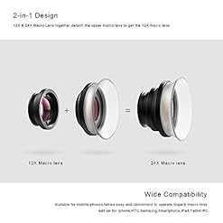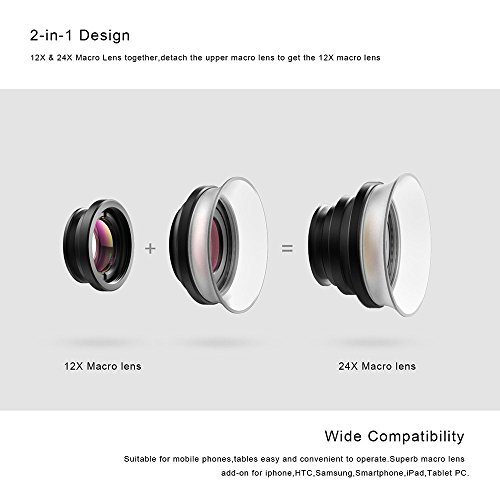 2-in-1 DESIGN:12X/24X macro lenses in a 2 in 1 set-the two small lenses are screwed together upon arrival.To use 24x macro lens,attach both lenses together;to use the 12x macro lens,simply unscrew the 24x macro lens.