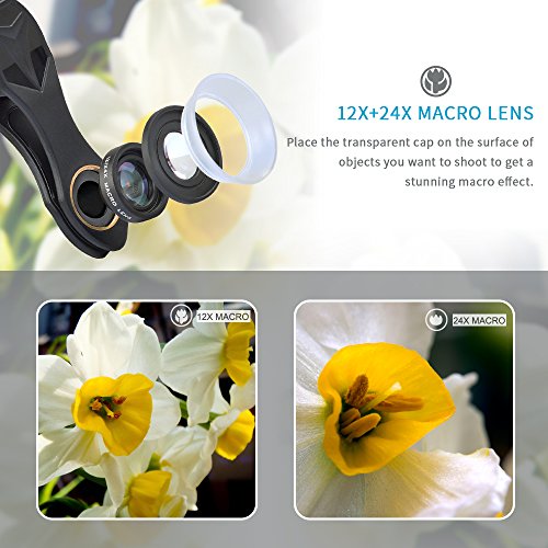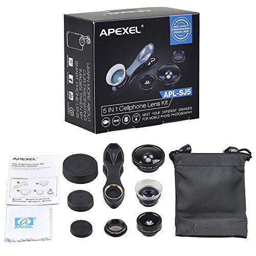 APEXEL 5 in 1LENS KIT: included 0.4x super wide angle lens,198 degree fisheye,12X/24X macroand circular polarized lens(CPL) ,you can create many