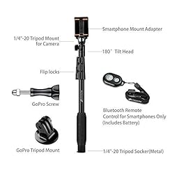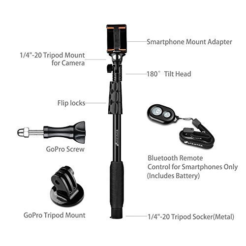【Wide compatibility】This selfie stick not only for smartphones, but also for cameras, DSLR and any other compact cameras. Gopro adapters, phone mounts, bluetooth remote controls(for phones only) are included in the package