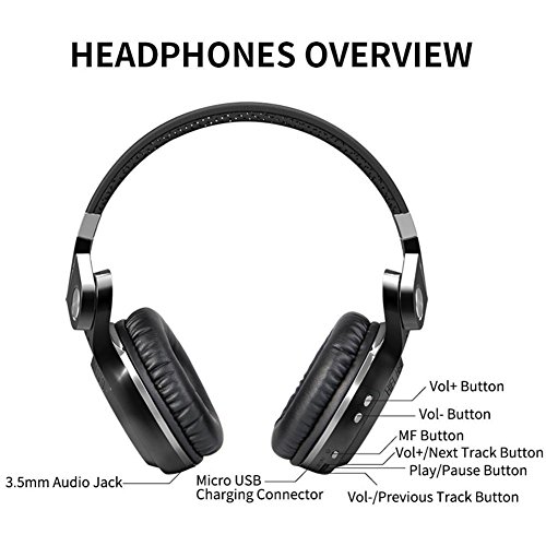 Features: Great sound from 57mm drivers. Deliver powerful, expressive audio. Cool look. Ear cups can rotate up to 195°, easy to carry on the move. FM broadcast/Micro SD card. Playback of MP3 and WAV audio formats(Micro SD card not provided). Bluetooth 4.1 low-power technology. Up to 40 hours continuous music time. Bluetooth/Wired. With the included cable, you can still enjoy favorite music when the battery runs low.