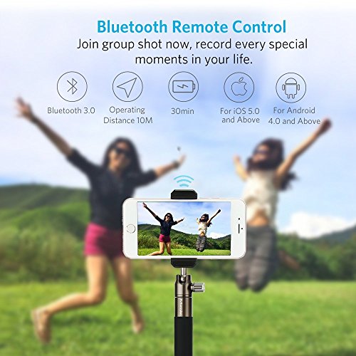 Easy Bluetooth Remote Control. The selfie stick comes with Bluetooth function, which allows you to take self-photographs with remote embedded on the selfie stick, or to stand away and use the Bluetooth remote control to take pictures or record videos. The remote control range can be up to 10 meters in the case of no obstruction.
