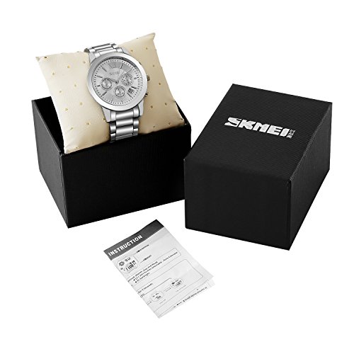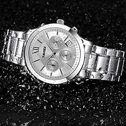 LIGHTWEIGHT AND COMFORTABLE, Unlike other chunky stainless steel watches, this steel watch is medium and lightweight. Solid 304 stainless steel 3-link band offers you a sense of lightness and comfortable wear experience.The watch case is made of high quality 304 stainless steel, which is never fade. The watch face is made of high hardness and scratch resistant glass,which is not easy to break off. Powered by a Japanese quartz movement, the watch provides precise time and can serve for 3 years.
