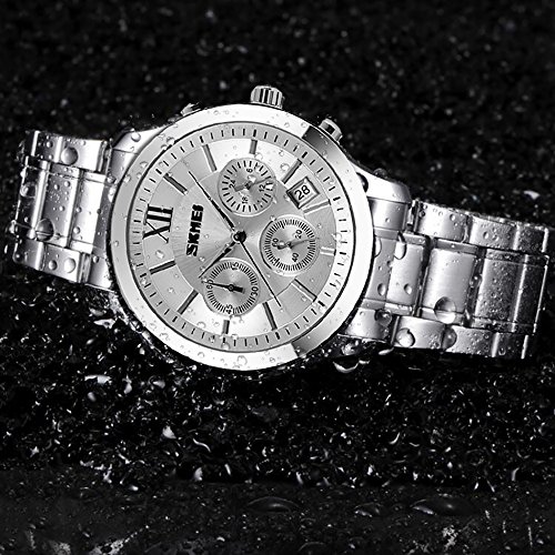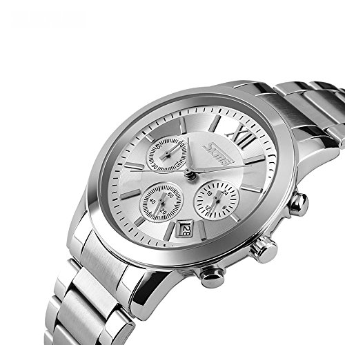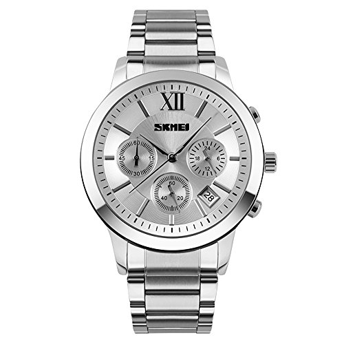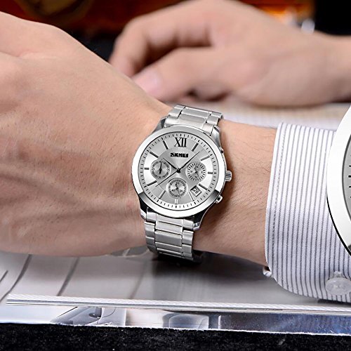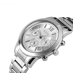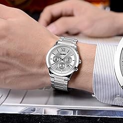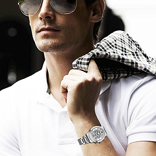 DAILY USE FOR BUSINESS OR PLEASURE. This 43 mm silver dial watch is simple, pratical and fasion. It displays time, date and have the special function: stopwatch. It will add more convenience to your life and enables you to easily spice up a normal dressing. What’s more, classic silver appearance goes great with any occasion, such business or daily use.