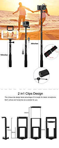 2 IN 1 CLIPS DESIGN: Best fit for tablets between 4.45 to 7.2 inches and various smartphones 2.25 to 3.15 inches, as well as for cameras with the tripod stand or selfie stick. You deserve a professional High End Alloy Selfie Stick!