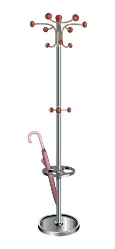 - An elegant tubular steel coat stand finished in light wood and metallic grey