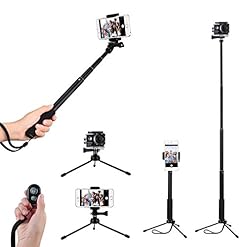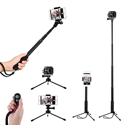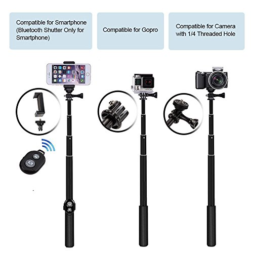 Multi-Function:①Use it as selfie stick for Gopro, SLR Camera, Phone ②Use it to take a group photo by installing the Tripod ③Use it as a mobile support, free your hands.